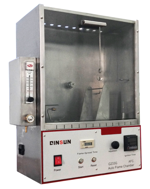 将试样安装在燃烧室中呈45°角倾斜的试样架上,使火嘴靠近试样,用火焰点燃试样规定时间后返回,观察试样的燃烧情况和火焰在试样上的蔓延速度,评估试样的可点燃性及火焰蔓延性能。