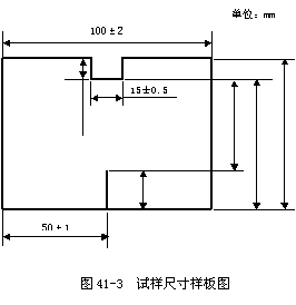 每个实验室样品裁剪经向和纬向两组各为5块的试样,每块试样裁取时应使短边平行于织物的经纱或纬纱,以保证撕裂沿切口进行。试样的短边与经向平行的称为“纬向撕裂试样”,试样短边与纬向平行的称为“经向撕裂试样”。试样尺寸如图41-3所示。