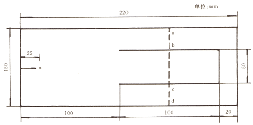 ②、双舌试样(见图2)为矩形长条,长220mm±2mm,宽150mm±2mm,每个试样切开一个沿长度方向的(100mm±2mm)×(50mm±1mm)的舌形,距舌端的50mm±1mm处在试样的两边画一条直线abcd。在条样中间距未切割端25mm±1mm处标出撕裂终点。