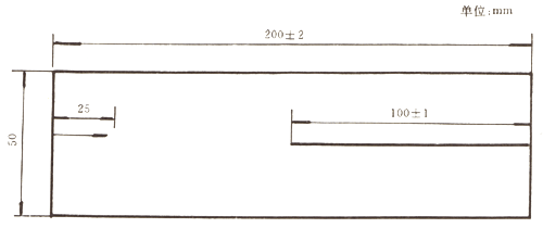 ①、单舌试样(见图1)为矩形长条,长220mm土2mm,宽50mm±1 mm,每个试样应从宽度方向的正中切开一长为100mm±1mm的平行于长度方向的裂口。在条样中间距未切割端25mm±1mm处标出撕裂终点。