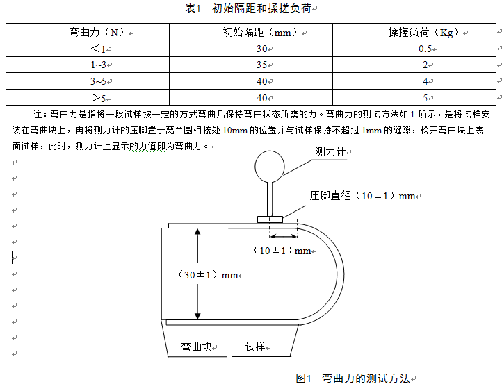 1 将试样安装于初始位置在一条直线上的两个试样夹内,两试样夹之间的初始隔距根据试样厚度按表1选择,并保持其不受力。