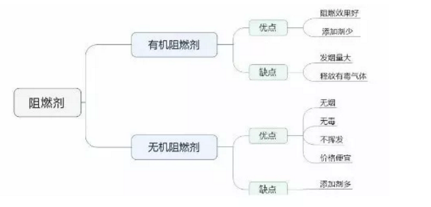 一般来讲,阻燃剂种类多样,分有机阻燃剂以及无机阻燃剂,有机阻燃剂阻燃效果好,添加剂比较少。不过有机阻燃剂在燃烧中存在发烟量大以及释放有毒气体的弊端。无机材料具有无毒、无烟、不挥发以及价格便宜等优点,不过其中存在大量添加剂。