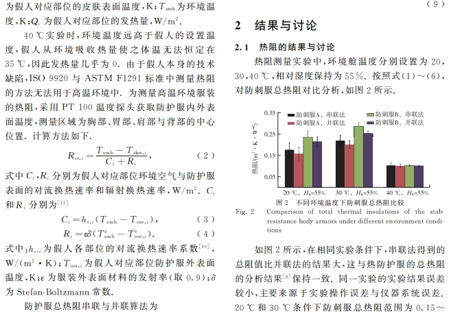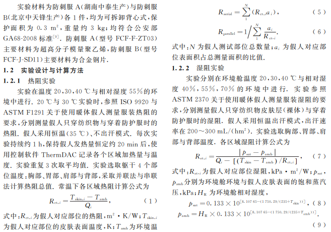 一般情况下,人体核心温度需要在37℃左右以保持舒适[2].防刺服作为人与环境间热量交换的重要介质,参与建立了人体 服装和服装 环境两个热交换环境.作为特殊防护装备,防刺服的隔热和传湿性能与一般服装有很大不同,多层基板往往会激发人体热应力,使警卫安保人员感到心理压力和生理疲惫[3],从而带来危险.因此研究防刺服的热湿传递性能有利于满足人体与环境间动态热平衡、实现人体 防刺服 环境系统的协调优、预防因热量堆积导致体能速降和穿着不适带来造成的危险.服装的热湿传递性能测试方法有主观评价法和客观测量法.主观评价方法偶然性较强,不同个体接受 认知 反应的差别导致测试结果存在较大差异.客观测量法通常通过测量服装热阻与湿阻,对其热湿传递性能进行评价.服装热阻表征了服装层两面的温度差与垂直通过服装单位面积的热流量之比,反映了服装的隔热保暖能力;湿阻表征了服装层两面的水蒸汽压力差与垂直通过服装单位面的蒸发热流量之比,反映了服装的透湿能力[4].